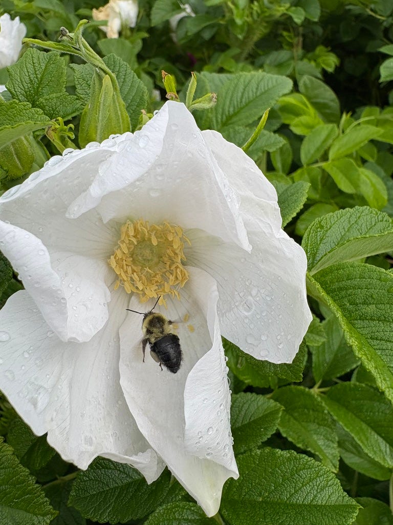 beach roses wet with rain, bumblebee is here again