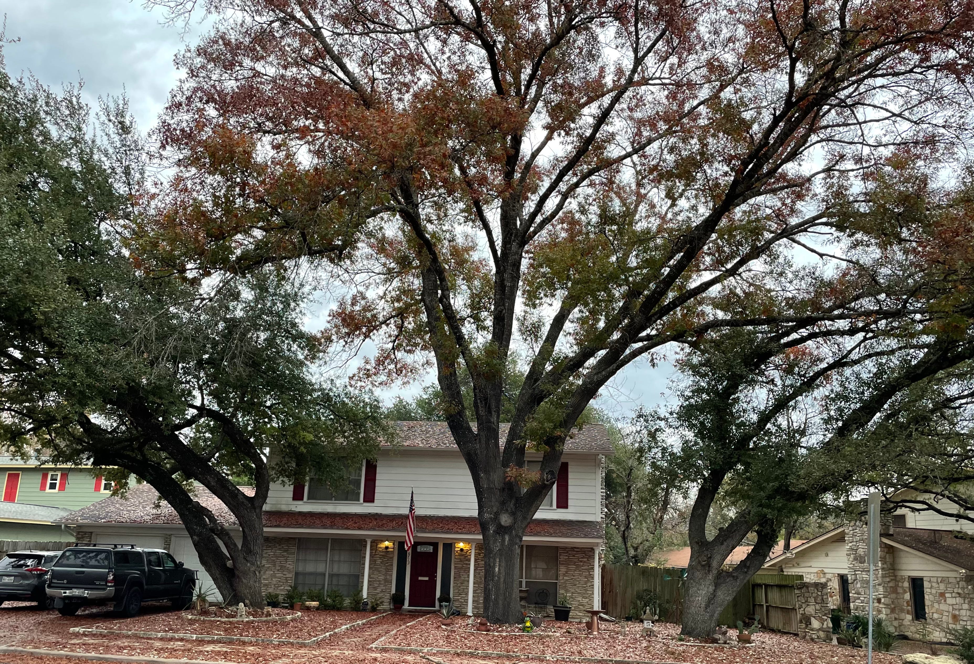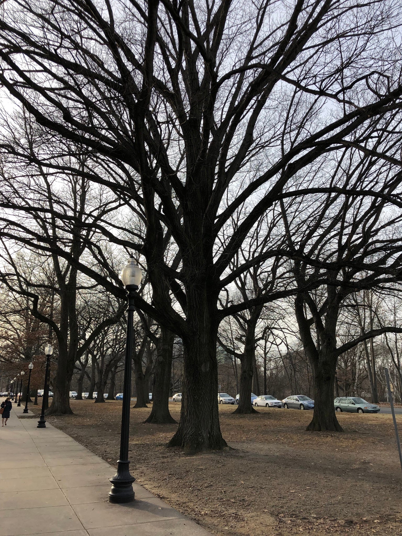 stripped of their leaves, stately oaks lift dark arms in supplication