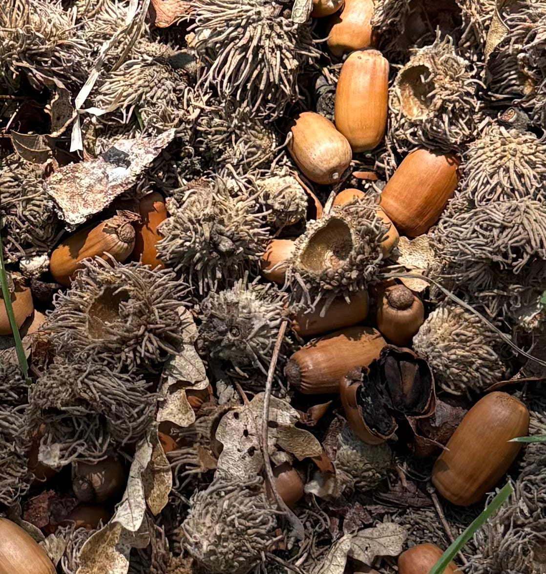 I come from the land of live oaks but we have no oaks in our neighborhood only maples, locusts, catalpas pines and spruces and sycamores. when I find an oak I squirrel away pockets full of acorns So many shapes and sizes long and skinny, pointed, round, cups scaly or furry every one a treasure