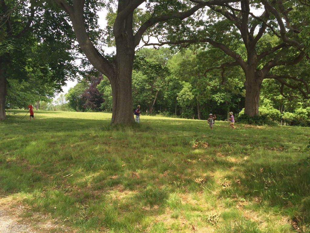 Under the oakshade four explorers with sticks warm day in June